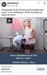 | Nackademin reklam | Skådespelare/avancerad statist | Ballerina till komisk reklamfilm/ bilder | Chriffer.se | 2022 |